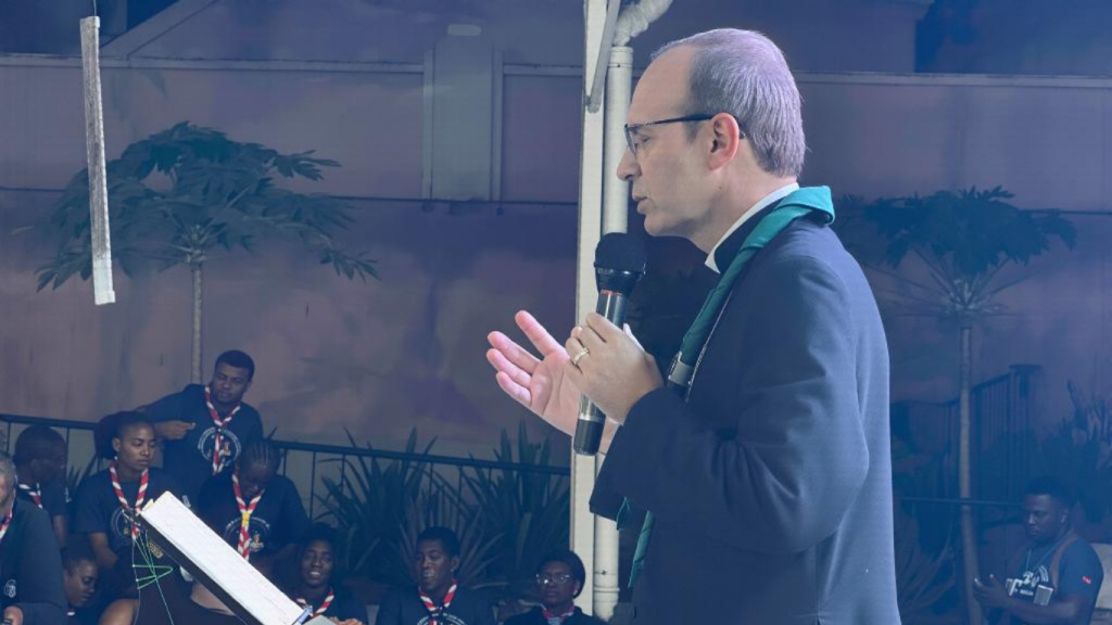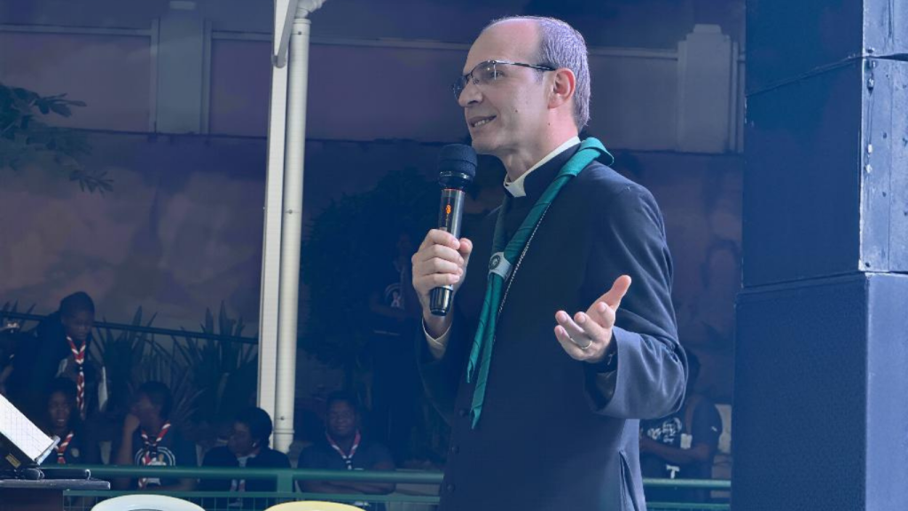 Radicado há quatro anos em Luanda como visitador da Obra de Maria em Angola — presente também em Cabinda, Benguela e Malange — o sacerdote começou por saudar a presença do bispo celebrante e por realçar, com emoção, a dedicação de Dom Belmiro ao escutismo. “A agenda de um bispo não é fácil… e o quanto ele se faz presente no escutismo é incrível”, afirmou, arrancando aplausos aos cerca de 500 caminheiros, dirigentes e assistentes espirituais reunidos.